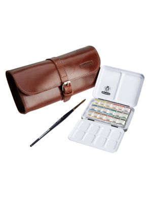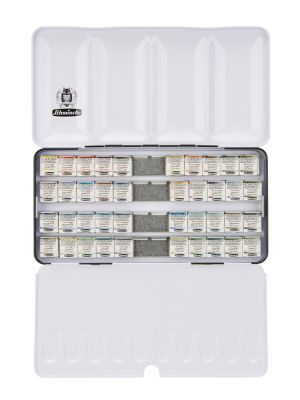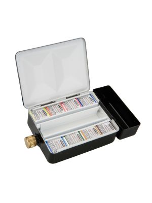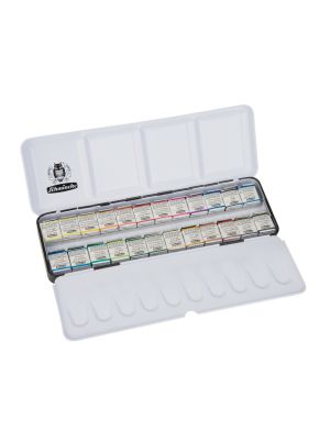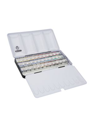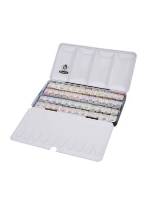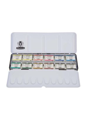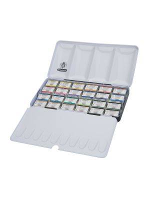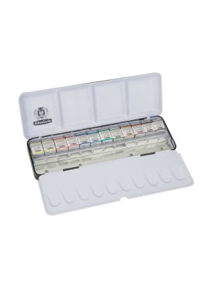 Sæt med 12 basisfarver og plads til 12 ekstra i metalæske. Indbyggede blandebakker og plads til en pensel i midten. Tommelfingerring til at holde sættet som en palette.
