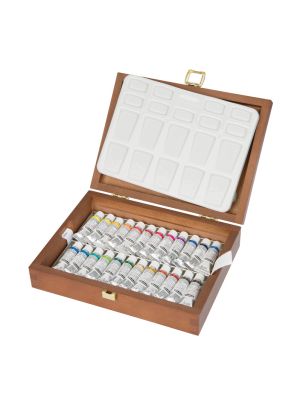 Sæt med 24 basisfarver i mørk trææske. Porcelænspalette medfølger.