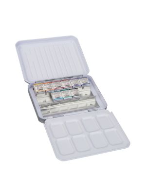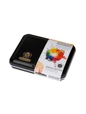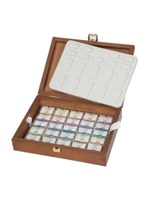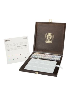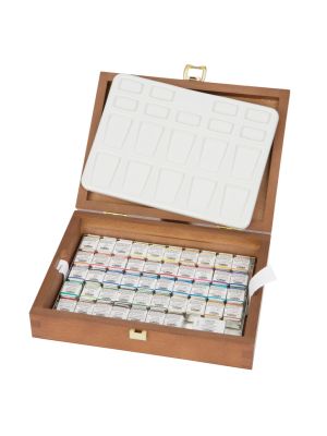 Sæt med 47 basisfarver i ½ pan, en helpan oksegalde og porcelænspalette med 10 store og 9 små huller. Kommer i mørk gaveæske af træ.