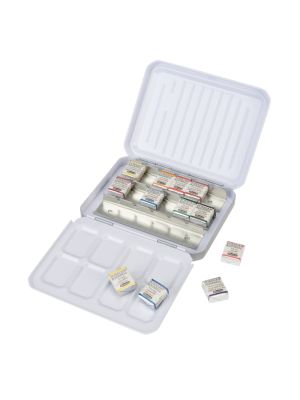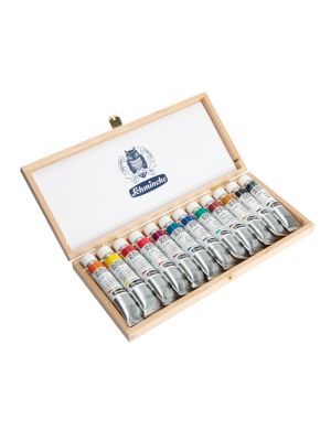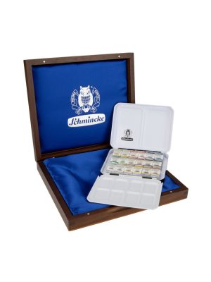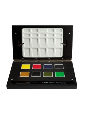 Sæt med 18 basisfarver i metalæske. Æsken har blandebakker i låget og kan indholde en pensel. Æsken er indpakket i flot, mørk trææske med velourindtræk.