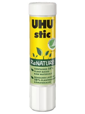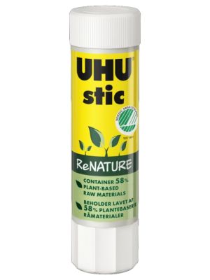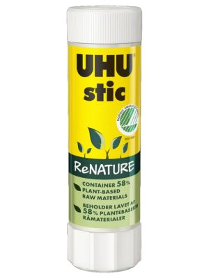 REnature limstiften er i en beholder fremstillet af 58 % plantebaseret materiale og har et lavt CO2-aftryk sammenlignet med andre limstifter. Svanemærket.