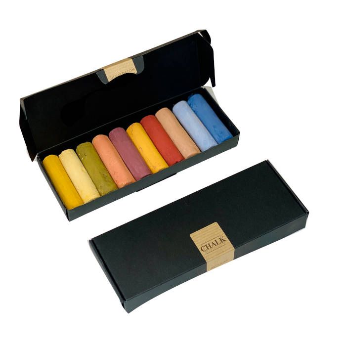Håndlavede pastelkridt med kridt fra Stevns klint. Fremstillet i Danmark. Kommer i sort papæske.