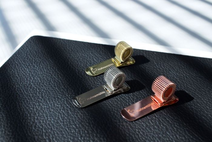 Sæt med 3 penneholdere af metal. Penneholderne har en klemme, så de kan sættes på notesbøger, blokke, tasker eller mapper - og tages af igen - og genbruges. Sættet består af en klemme i guld, sølv og rødguld.