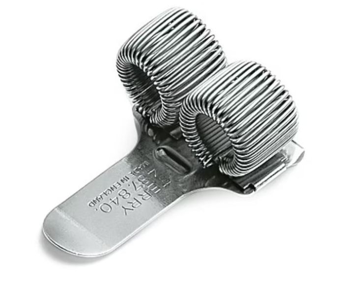 Penneholder af metal. Penneholderen har en klemme, så den kan sættes på notesbøger, blokke, tasker eller mapper - og tages af igen - og genbruges. Holder to penne.