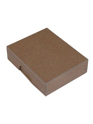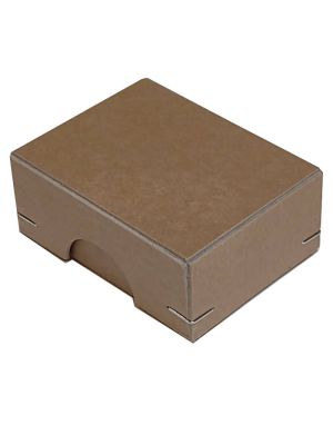 Hjørnehæftet æske i brun karton med løst låg og fingerhul i låget.