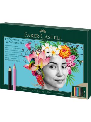 Gavesæt med 17 basisfarver i Polychromos, fire matte grafitblyanter i Pitt Graphite Mat samt viskelæder. De matte skitseblyanter harmonerer rigtigt godt med Polychromos-farverne, da de ikke har samme genskin som klassiske skitseblyanter.