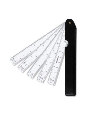 Målestok i vifteform i hvidt kunststof. Inddeling: 1:10 1:15 1:20 1:25 1:30 1:33,33 1:40 1:50 1:75 1:125