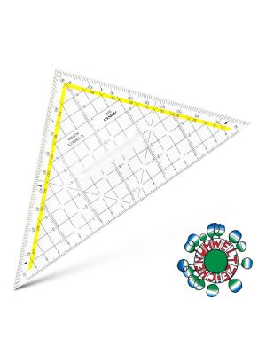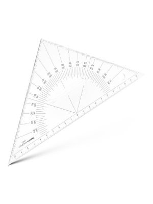 Geometritrekant i plexiglas med fast greb. Dybpræget inddeling og vinkelmål. Velegnet til navigation i luft- og søfart.