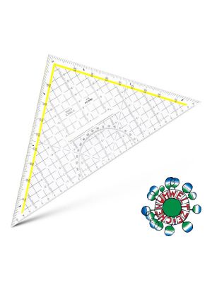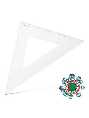 Geometritrekant i plexiglas med fast greb. Dybpræget inddeling og vinkelmål. 10 mm gitternet. Markerede vinkler i 7° og 42° til perspektivtegning, 75° til skråbetegnelse og 45° til let skravering. Facet på millimetermålet.